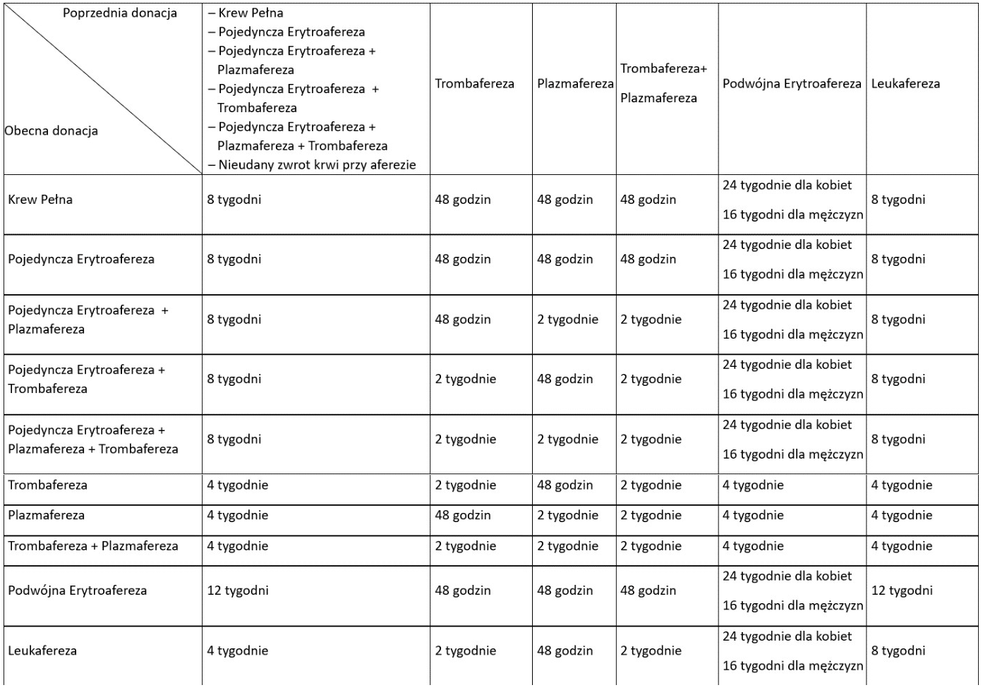 Dopuszczalną ilość oddawanej krwi i jej składników oraz częstotliwość ich oddawania określa Rozporządzenie o pobieraniu krwi i jej składników. Odstępy między oddaniami krwi i jej składników podano w tabeli poniżej.