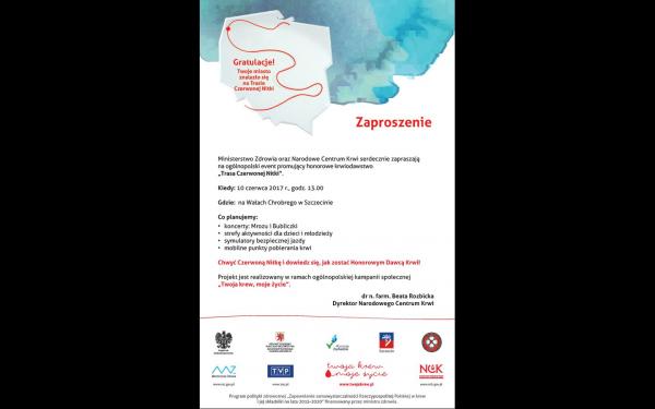 z największą przyjemnością zapraszam na wyjątkowe wydarzenie - ogólnopolski event promujący honorowe krwiodawstwo pn. „Trasa Czerwonej Nitki” realizowany w ramach kampanii społecznej „Twoja krew, moje życie” (zaproszenie w załączeniu).